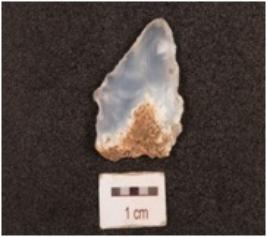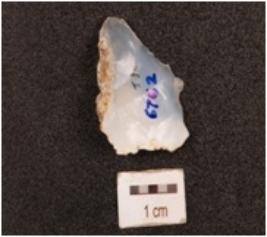 | Description / विवरण | Flake made of chalcedony, irregular in shape, uneven surface, irregular retouch marks on edges, diffused bulb on ventral side. |