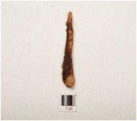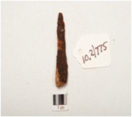 | Description / विवरण | A nail made on iron, elongated body, flat broad at top end, pointed towards other end, rusted surface, rectangular in section. |
