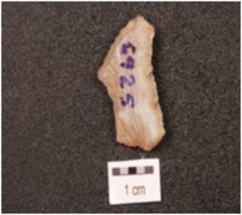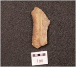 | Description / विवरण | Fragment of an utilized flake made on an end struck chalcedony flake, prepared platform, diffused bulb on ventral side, use-wear marks along sharp edges. |