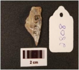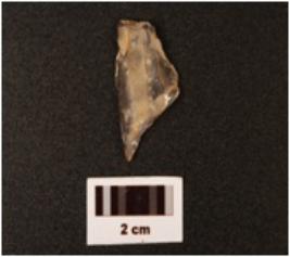 | Description / विवरण | Point with one end broken, positive bulb visible on one side, striking platform near the bulb, working edges have retouches, triangular cross section. |