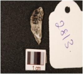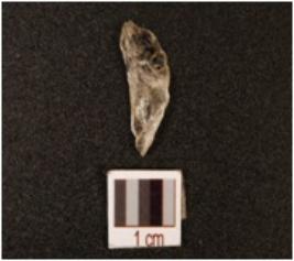 | Description / विवरण | Lunate with one end pointed, a convex side and a slightly concave side visible, rough surface. |