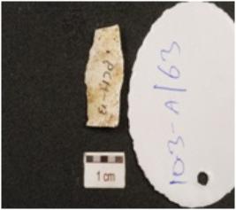 | Description / विवरण | A blade made on chert, prepared platform on proximal end, double ridge on dorsel side, use wear marks on working edges and triangular cross section. |