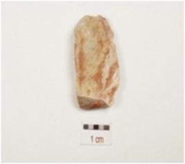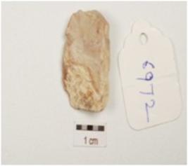 | Description / विवरण | Flake made of end struck chert, bulb on ventral side, prepared platform on proximal end, use wear marks along one lateral side. |