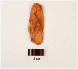 | Description / विवरण | Blade, made on chert, use wear mark on the cutting edges, diffused bulb on the ventral side prepared platform on the proximal end, mid ridge on the dorsal side. |