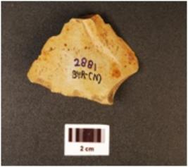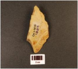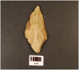 | Description / विवरण | A flake made on chert, with one side retouching marks, flake marks on dorsal, pointed proximal end, distal end is visible, prepared platform on edge. |