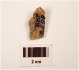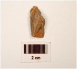 | Description / विवरण | A flake, made on chert, flake marks on dorsal, use wear marks on edges, distal end is broken, defused bulb on proximal end. |
