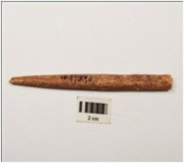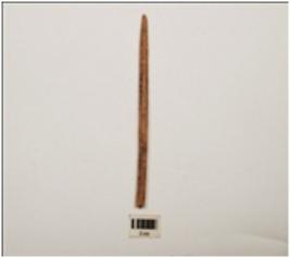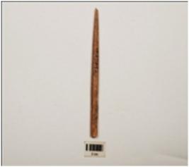 | Description / विवरण | Bone point, long in size with smooth and grains on surface, polished towards pointed end and broken from thick end, criss cross incised design on surface and oval in section. |