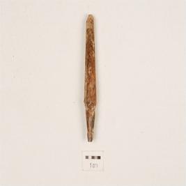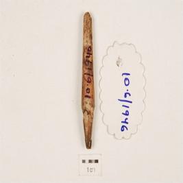 | Description / विवरण | A point, made on bone with well polished surface, pointed one end with given heat treatment and rectangular in section, broken other end. |