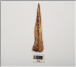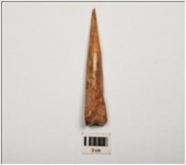 | Description / विवरण | Bone awl, polished and glossy surface with a thick, broad end, slightly broken at pointed end with cracks, light brown in colour with irregular section. |