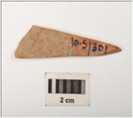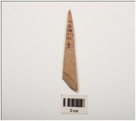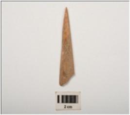 | Description / विवरण | Fragment of bone point, polished towards pointed end and broken at other end, flat surface rectangular section and vertical crack mark on sides. |