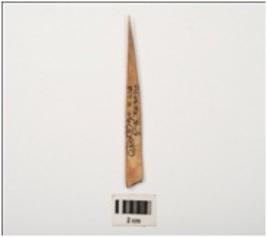 | Description / विवरण | Bone point with polished and, flat surface, pointed at one end and partly broken at flat end, rectangular in section and light brown in colour. |