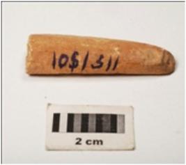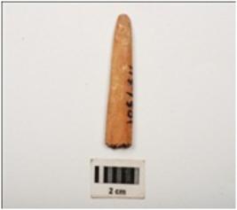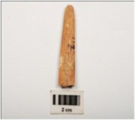 | Description / विवरण | Fragment of bone point with polished surface, broken at both pointed and thick ends, plano convex in section and light brown in colour. |