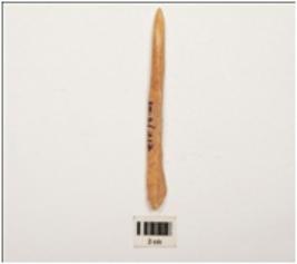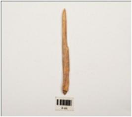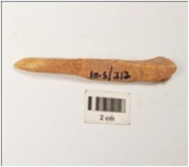 | Description / विवरण | Bone point, polished towards pointed end long in size, triangular section and light brown in colour, partly broken at thick end. |