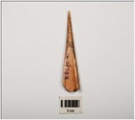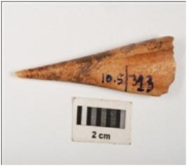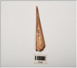 | Description / विवरण | Fragment of bone point with polished surface, tapering shape, pointed at one end and broken at broad end, rectangular in section and light brown in colour. |