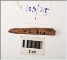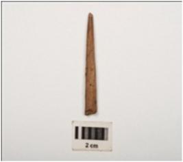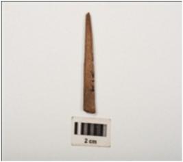 | Description / विवरण | Fragment of bone point with smooth surface and polished towards partly broken pointed end, broken at thick end, incised line and grain on surface, oval in section. |