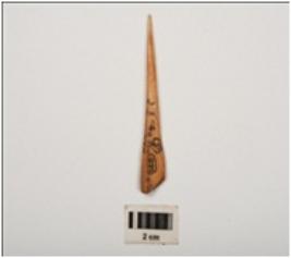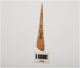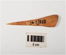 | Description / विवरण | Bone arrowhead with smooth surface and polished end, flat and broad at other end. Light brown in colour. |