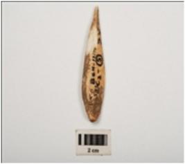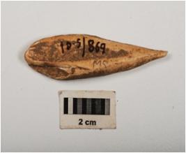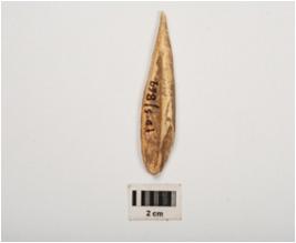 | Description / विवरण | Bone arrowhead with partly broken pointed end and polished surface, broad and flat at other end, light brown in colour. |