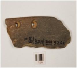 | Description / विवरण | Fragment of a harvester made on stone with double perforation and smooth surface. |
