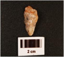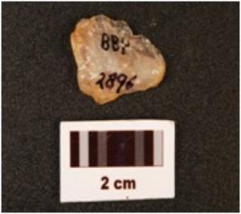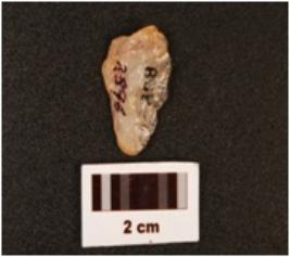 | Description / विवरण | Point, made on quartz diffused bulb on the ventral side, use wear mark on the cutting edges, proximal end broken, mid ridge on the dorsal side. |