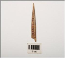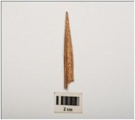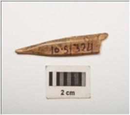 | Description / विवरण | Fragment of bone point with polished surface and partly broken pointed and thick end, rectangular section and light brown in colour. |