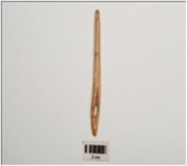 | Description / विवरण | Bone needle with eye, polished surface, circular section, broken and mended on top and in middle, light brown in colour and partly broken tip. |