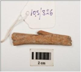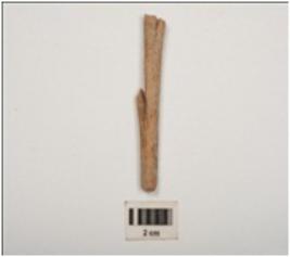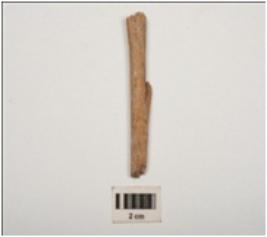 | Description / विवरण | Bone harpoon with smooth surface and barb, broken from both ends, circular section and light brown in colour. |