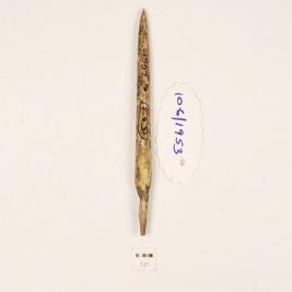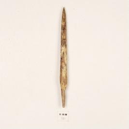 | Description / विवरण | A tanged point made on bone with polished surface, pointed both ends, slightly broken one end and oval in section. |