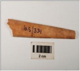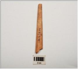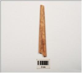 | Description / विवरण | Fragment of bone point with polished surface and broken from both ends, oval section, fine vertical crack on surface and light brown in colour. |