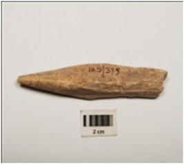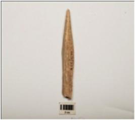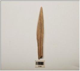 | Description / विवरण | Bone spearhead with polished surface and partly broken pointed end, rectangular in section and broken at flat end, cream in colour. |
