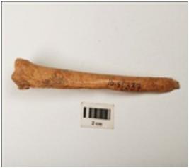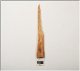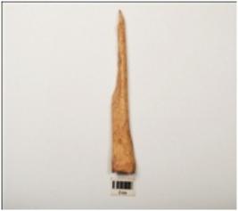 | Description / विवरण | Bone spearhead, polished surface with one thick broad end, partly broken from centre till pointed end, light brown in colour and rectangular in section. |