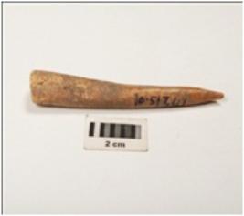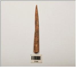 | Description / विवरण | Bone point, polished surface with one flat thick end, partly broken at pointed end and circular in section. |