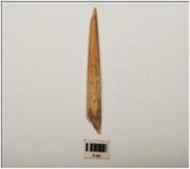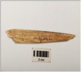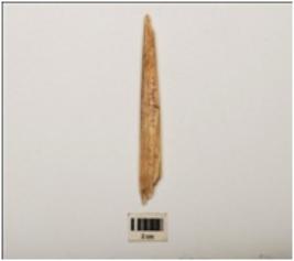| Description / विवरण | Bone arrowhead, polished surface, broken from both pointed and thick ends, cream in colour and rectangular in section. |
