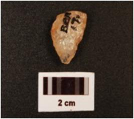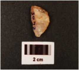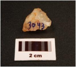 | Description / विवरण | A lunate, made on quartz, unfinished, prepared platform, irregular marks on edge, dorsal and ventral sides are uneven, distral end is broken, defused bulb on proximal end. |