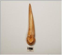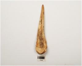 | Description / विवरण | Bone point, modified convex on top, pointed one end, groove line on one side, both sides hollow on top portion, smooth and polished surface. |