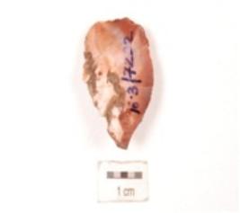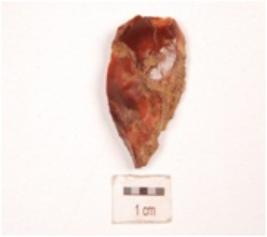 | Description / विवरण | Flake made on an end struck carnelian flake, prepared platform, prominent bulb on ventral side, sharp convex lateral edge with use-wear marks. |