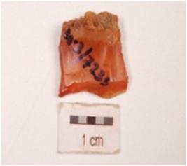 | Description / विवरण | An end scraper made on an end struck carnelian flake, cortex on one end, negetive bulb on ventral side, concave convex cutting edge with retouches. |