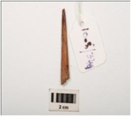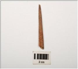| Description / विवरण | Fragment of a bone point, polished surface with one pointed ends, brown in colour, both ends are broken and rectangular in section. |