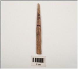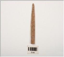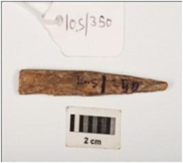| Description / विवरण | Fragment of bone point partly smooth and grains visible on surface, circular section and brown in colour. |