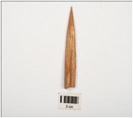| Description / विवरण | Bone point, pointed one end, broken top portion, groove line on one side, smooth and polished surface. |