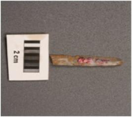 | Description / विवरण | Parallel sided microlithic blade with a prominent mid ridge on dorsal side, diffused bulb o n ventral side, triangular in section, use wear marks on cutting edges, broken at distal end and slightly broken at right dorsal side. |