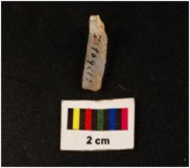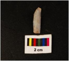 | Description / विवरण | Blade with a curved proximal end, a ridge on dorsal side, broken distal end and use wear marks on both the working edges. |