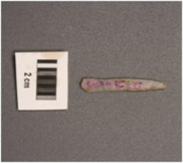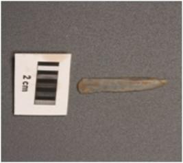 | Description / विवरण | Parallel sided microlithic blade with two ridges on dorsal side, diffused bulb on ventral side, broken at distal end, trapezoidal in section and use wear marks on cutting edges. |
