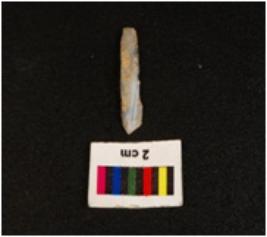 | Description / विवरण | A Parallel sided chalcedony blade with prominent mid ridge on dorsal, diffused bulb on ventral side, broken at distal end, use wear marks along the cutting edges, triangular in section. |