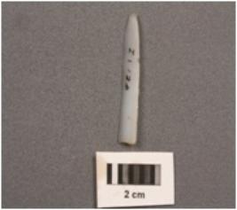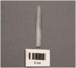 | Description / विवरण | Parallel sided chalcedony blade, two ridges on dorsal side, use wear cutting mark on edges, diffused bulb ventral side, slightly broken along distal end. |
