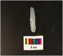| Description / विवरण | Pen knife shaped chalcedony blade, double ridges on dorsal, use wear edges, diffused bulb. |