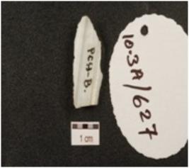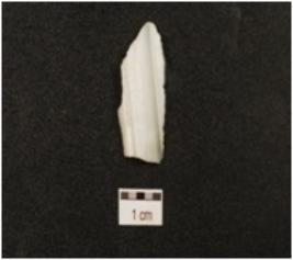 | Description / विवरण | A blade made on chalcedony, prepared platform, pointed distal end, blade scars on dorsal side and use wear marks along cutting edge. |
