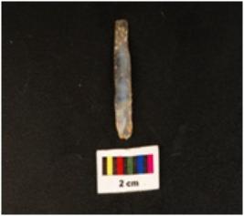 | Description / विवरण | Parallel sided chalcedony single ridge on dorsal, use wear edges, diffused bulb, distal end. |