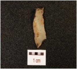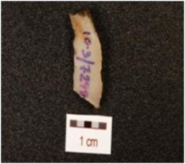 | Description / विवरण | Blade made on chalcedony with single ridge on dorsal side, use wear marks on cutting edge, triangular in section and white in colour. |