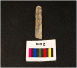 | Description / विवरण | Parallel side microlithic blad with double ridge on dorsal side, trapezoidal in section, distal end and proximal ends are broken, use wear mark along the cutting edges. |