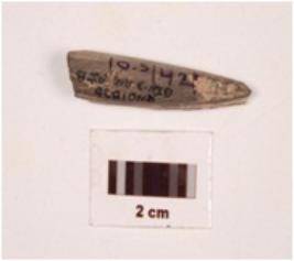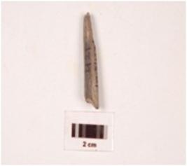 | Description / विवरण | Fragment of pointed arrow bead stone, plano convex in section, greyish colour, smooth surface. |